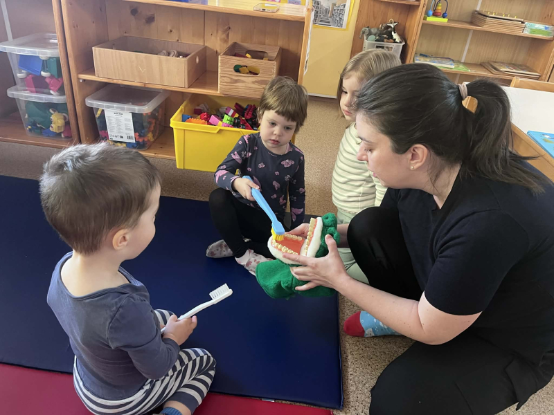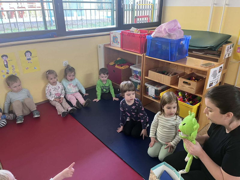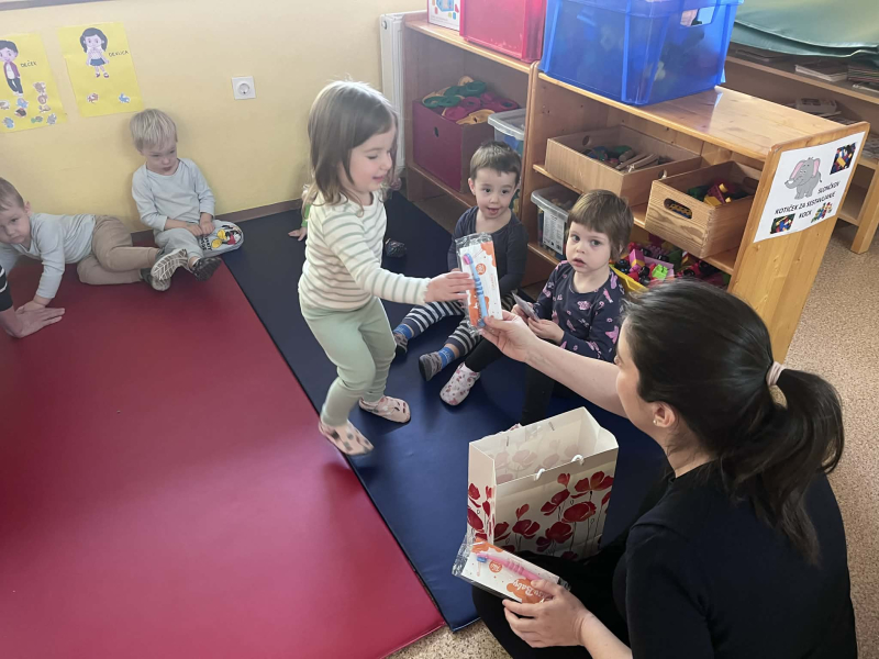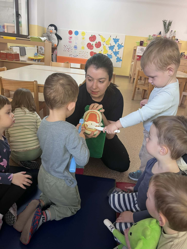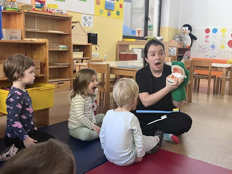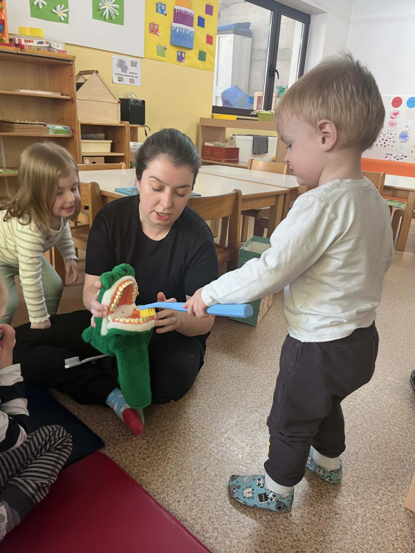 Danes je bil poseben dan, saj se nam je v skupini pridružila mamica deklice Julije Ive, ki nam je predstavila poklic zobozdravnice in nas naučila pravilnega umivanja zob. Ob branju prijetne in poučne zgodbice o okrokodilčku Krištofu, nam je približala poklic zobozdravnika. Otroci so krokodilčku Krištofu pomagali do čistih zob tako, da so mu s krtačko le te pravilno umili. Mamica Edina je vse otroke razveselila z novo zobno ščetko, ki so jo otroci odnesli domov.Otroci iz skupine SLONČKI (2-3let)