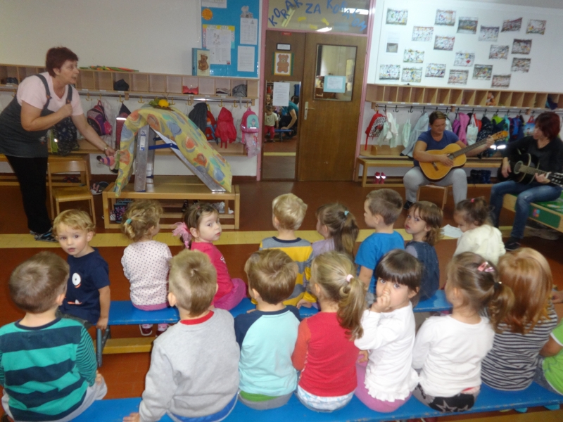 V sredo nas je obiskala BOTRA JESEN. Skozi uganke, pesmi in deklamacije nas je spomnila na to, kako se v naravi z letnimi časi vse menja. No, menjava pa je čakala tudi otroke. Skupine so si namreč zamenjale igralnice. Navdušenja nad drugačnimi igračami, postavitvijo igralnic, celo nad stenskimi označbami za dežurne, niso mogli skriti.