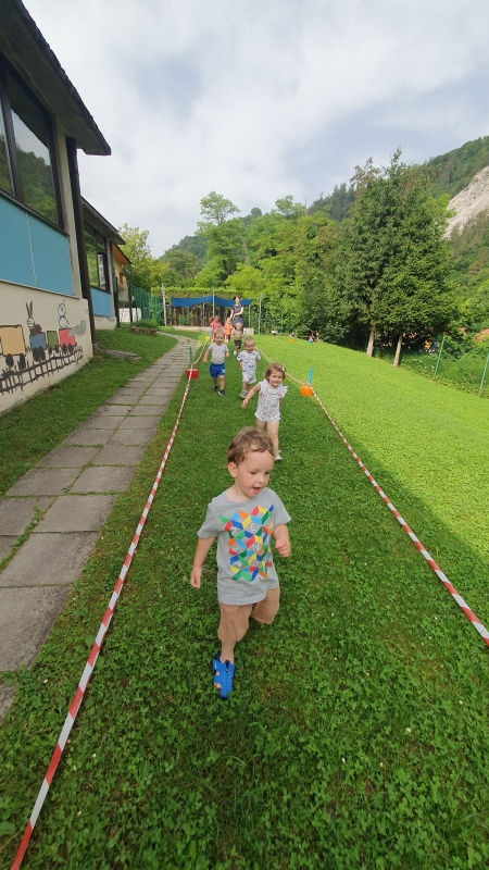 V četrtek, 20. 6. 2024, smo na spodnjem igrišču enote organizirali tek. Na poti je otroke poleg teka pričakalo tudi nekaj ovir, katere so morali prestopati, se spustiti po toboganu, teči v slalomu, se plaziti pod tunelom iz vodnih črvov in se pognati v hrib. Teka se je udeležilo večina slupin iz enote, vsi udeleženci pa so na koncu prejeli tudi medalje.