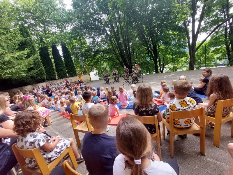 Danes so nas s svojim obiskom razveselili člani Orkestra Slovenske vojske in nam pričarali glasbeno dopoldne. Na zanimiv način so nam predstavilk inštrumente, nam povedali nekaj več o sebi, se z nami igrali glasbene uganke, zaigrali nekaj znanih skladb in nam s pomočjo inštrumentov naslikali ozadje (zvoke) krajše pripovedi. Z veseljem smo jim prisluhnili vsi, starejši in mlajši, nekateri pa so se celo toliko opogumili in jim tudi dirigirali.