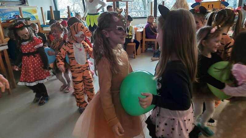 Oddelki starejšega in mlajšega starostnega obdobja so organizirali pravo pravcato pustovanje. Med starejšimi oddelki se je vsaka skupini ob veseli gasbi predstavila, potem pa so se po skupinah (glede na vrsto maske) igrali različne zabavne gibalne igre, ter skupaj zaplesali. Mlajši oddelki pa so rajali v igralnicah in na terasi, ter prav tako uživali v skupnem druženju. V nadaljevanju objavljamo nekaj foto utrinkov pustovanja.